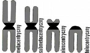 - submetacentryczny - centromer położony jest blisko środka chromosomu, ale nie dokładnie w połowie jego długości,